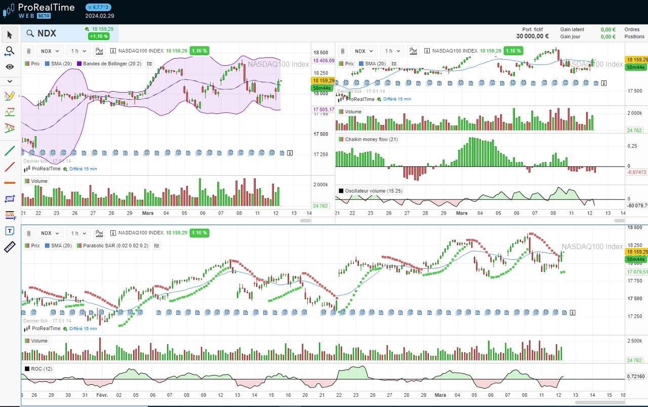 Avec l’exemple ci-dessus sur la plateforme ProRealTime Web, il suffira de changer et passer de l’indice Nasdaq à l’indice CAC 40 pour garder l’ensemble des indicateurs techniques et la façon dont ils sont configurés, comme ci-dessous :