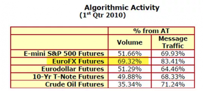 Ces dernières années, le trading algorithmique et les robots de Trading ont pris une place de plus en plus importante et sont devenus prépondérants sur le marché des actions et celui des contrats Futures. Rien que sur le contrat Future 6E sur l’EUR/USD, par exemple, le CME annonçait déjà en 2010, que 69% des volumes traités étaient de nature algorithmique.